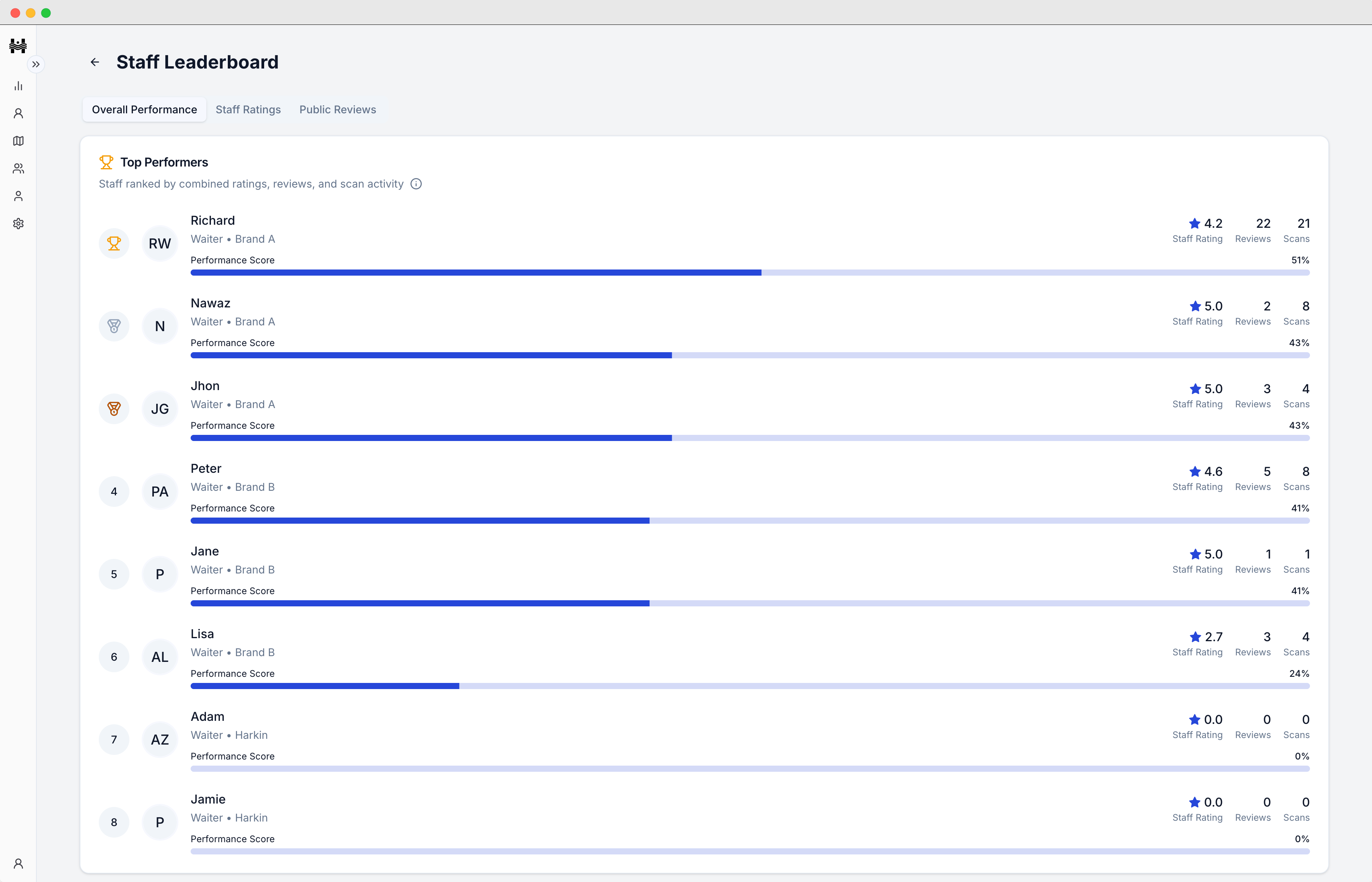 Foster a culture of excellence with our staff leaderboard. Watch as friendly competition drives better service and more positive reviews, all while building team spirit.